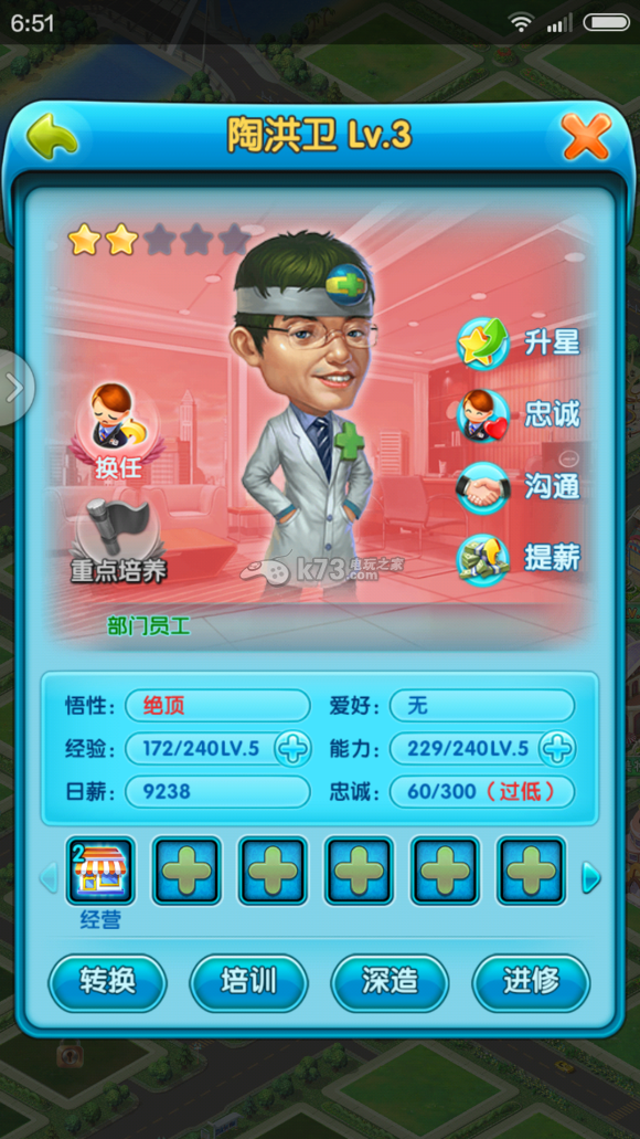 然后按照你的土豪等级选择合适的低级员工培养吧,能增加不少收入,偶尔出了部门技能还能放到部门里面任职,划算还能省金币升级。这里展示一些本人培养的部门员工吧(猎聘的都是10级的哦)所以肯定不是猎聘的
