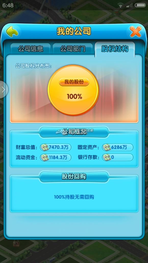 第十,股权回购,还记得巴菲特游戏刚开始投资的100W吗?那是买了你的20%股份,股份在资产超过5000W的时候可以回购,但是资金(现金)要达到资产的20% ,一定要尽早留钱回购,因为你资产越高,回购的钱越多,而巴菲特,是会享受你20%的收益的,你会凭空少了20%收益