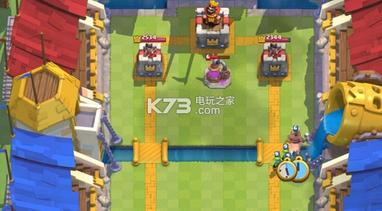进攻思路:使用“跳猪”的技巧让野猪避开防御塔的吸引,直接攻击公主塔消耗其血量。将野猪和哥布林放在这个位置(下图),猪会直接跳过河道,中间的塔是不会吸引到野猪的,越过一些塔来祢补我这套路的进攻性不足。
