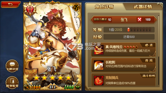 5星张飞应该算是对付骑兵队最好用枪兵了,虽然有着被动较少的问题,但在基础属性上和标准近战一样,与关羽一样,是一名高输出的武将,【克制骑兵】是每个枪兵必备的技能,配合上张飞强大的【真·风卷残云】可以对骑兵队造成毁灭性的伤害,【风刃】将原有的【风卷残云】提升了一个档次,用一格能量换取大范围的一次群伤伤害,【迅雷疾风】则是游戏目前唯一一个能获得3格能量的技能,配合上【最强军师】能够在天梯中迅速搬回局面,尤其对目前徐荣有一定克制能力,等到张郃或一系列骑兵出了后估计会成为优秀的支援角色,【真·风卷残云】,在强化后作为4格能量的大招,依靠被动能快速触发一次,作为返场技能,但因为张飞本身少防御的问题,往往难以再次使用。