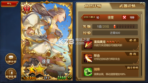 总体:前期很好用的武将,后期也有一定强度,如果要组骑兵队的话可以先放进去,比未升星的3,4星好一点