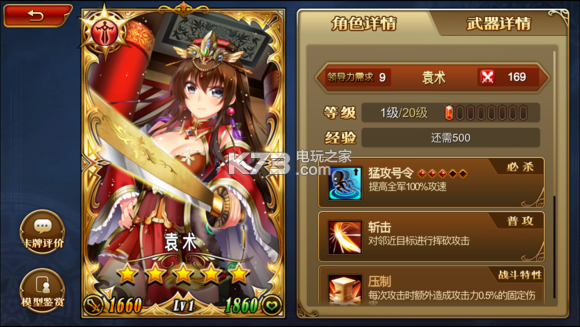 总体:很强势的近战,相比较袁术来说适用面较窄,但适用后效果更强,强烈推荐,方便后期刷材料,进攻有了可以直接挑战超过你几百分的,还能无脑增加友情值