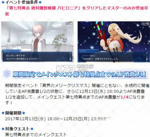 概要:本次活动由奈须蘑菇亲自执笔,活动剧情将随着时间的推进而开放。挑战活动任务,收集活动道具”冥界之砂“从阿提拉the圣诞处获得礼物吧。完成主线第八节后,从活动素材池中可用冥界之砂中抽取到的”军神交换劵“前往商店交换活动限定SR阿提拉the圣诞。