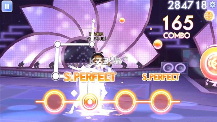 在歌曲进入副歌的过渡前,左手边长按音符并来回转折的同时,右手边是三个单击音符,在右手第三个单击音符落下的同时,恰好左手边的长按音符刚刚结尾,并快速落下一个滑动音符,这样一组音符就需要大家格外留意,因为在这里不仅音符下落的速度比较快,双手的操作也比较复杂,非常考验双手的灵活度与配合的默契度。
