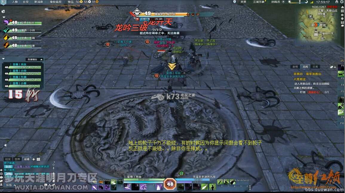 第四个boss真心坑爹,7爷威武霸气啊!全屏仍盘子有木有!还有小弟的有木有!如果卡了的话第三波的2个boss也会跟着出来。。。但是不卡的话就不动了变成旁边观战了。。。这个boss要注意打boss的人的配合他放控人的高输出技能时候会跳到天上,这个时候你放抱月惊风这样可以保护队友不会大失血(姨妈一击么!)而且他还会被限制不能跳跃的。然后残血的朋友打这个boss要万分注意他扔的盘子是减速定人加200+伤害的!(我是神威不知道别人的失血但是确实非常疼)我们死的好多次都是因为残血打小怪吸血时被干掉的。