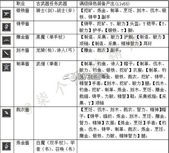 关于古物器的获得,是在战斗职业满50级后跟着主线接到的。其中一个步骤是需要上交一把自己职业的武器并镶嵌指定的两块魔晶石,上表所列出的,就是可以制作这把任务武器和对武器进行镶嵌的对应生活职业,这把武器是可以交易的,所以只做任务是可以直接去交易行买的。