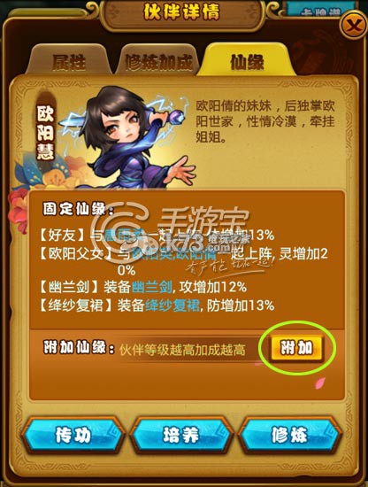 打开要添加附加仙缘的“伙伴详情”页面——“仙缘”——“附加”。