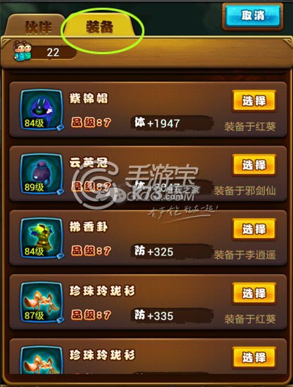 可能很多玩家都没注意到在选择附缘对象时我们可以选择装备作为对象。具体方法是:“伙伴详情”——“选择”——在选择界面点击上面的页签切换到“装备”页面——选择合适的装备。