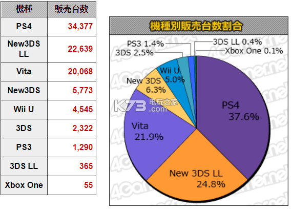 本周各大新作齐发,PS4/New3DSLL/PSV均有不错的销量,其中PS4仍以3.4万获得本周销量第一,New3DSLL则以2.2万排名第二,PSV降到第三,WiiU又回到5000台的位置,垫底为Xboxone。