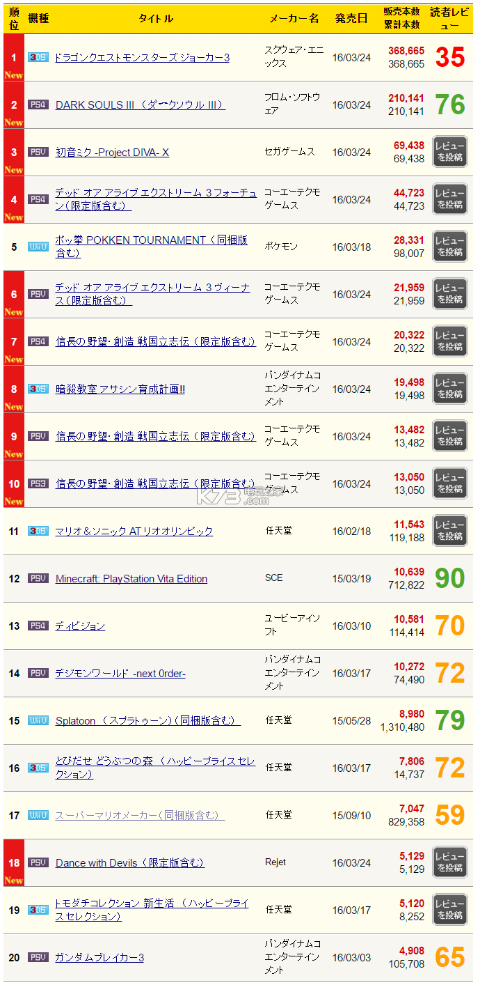 上周MC销量:3DS新作《勇者斗恶龙怪兽篇Joker3》以36.8万份夺取本周第一,日版先行的PS4《黑暗之魂3》以21万的成绩位居第二,PSV《初音未来歌姬计划X》以6.9万获得第三,PS4/PSV《死或生沙滩排球3》合计约6.6万分获四、六名,PS4/PSV/PS3《信长之野望创造战国立志传》合计约4.6万。硬件方面首位仍为PS4。