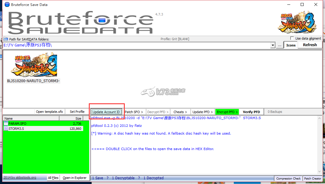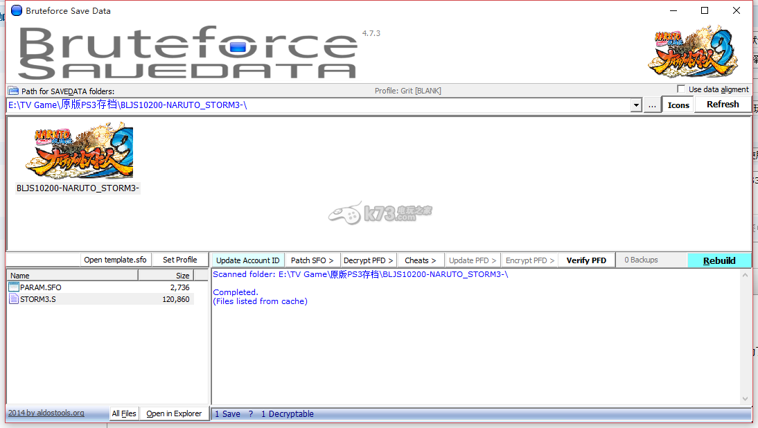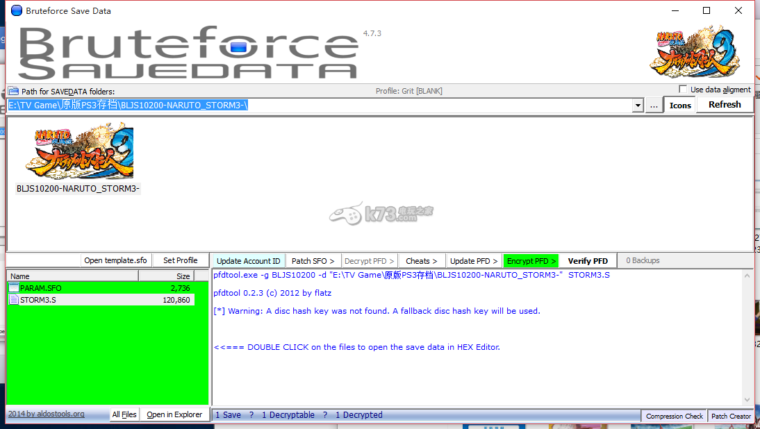 这里修改使用别人的PS3存档的软件是用的Bruteforce Save Data,现在最新版本为4.7.3,可在本站下载。