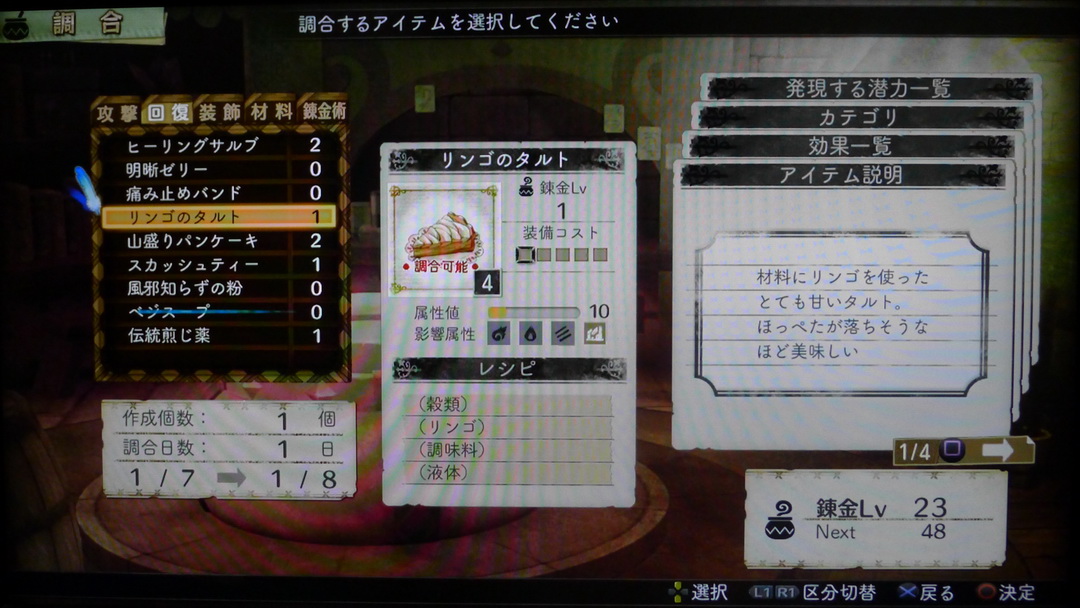 关于调和攻击和回复这两个,好像一次只能作一个,不能选定要调和几个,这代的数量目前只能靠土属性的Cost增加,所以固定只能做一个,不过装备在探险装备区后,总务会帮你补充,这是目前量产的方法。