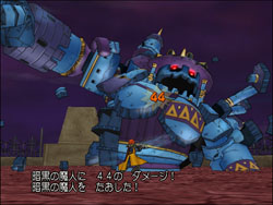 (暗黑神的HP大约4400,各种招式都会,普通攻击可以给予单体100以上伤害,メラゾーマ单体约100伤害,イオナズン全体约90伤害,凍える吹雪全体约120~140,あやしい瞳可必定使我方一人睡着,当然いてつく波動也少不了,要特别注意的是暗黑神的痛狠一击,一但中了杰西卡库库鲁基本是秒杀,单体可达到290~328。老杨要经常使用斧系技能かぶとわり降低它的防御)