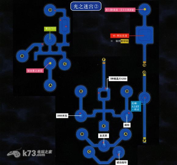 第五话敌人会大量使用带异常状态的攻击,建议带上防石化等威胁比较大的饰品出战。经过第四话BOSS战位置的传送阵进入第五话的主迷宫——光与影的迷宫。进入后马上开始强制战斗,建议多用全屏攻击快速解决战斗。光之迷宫①探索完毕之后不要忘了带着刚拿到的封印石回到据点解封,解封出来的是理查德,此人曾是FC的总BOSS,这次作为队员加入我方,战斗力极为惊人,拥有一流的速度、攻击力、魔法力,尤其是他的战技光鬼斩和光轮斩拥有极短的硬直时间,在战斗中可以连续使用,对BOSS造成巨大伤害。此时迷宫中的星之门⑦能进入了。