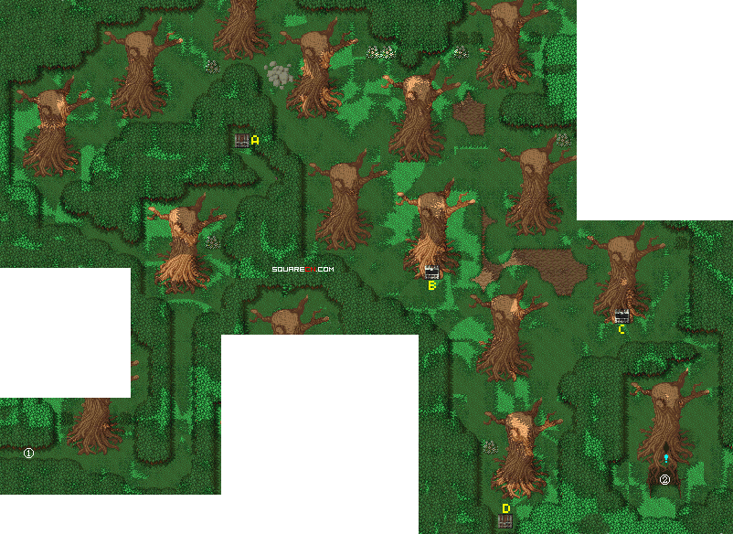 | 这和以前的长老之木挺相似的,都只能看到周围一小块地域,途中有4个宝箱,A、B、C、D依次是Dragon Fang(りゅうのきば)、Ribbon(リボン)、Power Rod(リリスのロッド)、Enchanter(エンハンスソード)。来到最后的树前调查树洞便可打开前进之路②,进入前须得打败BOSS——WoodSprite(カロフィステリ)。 |
