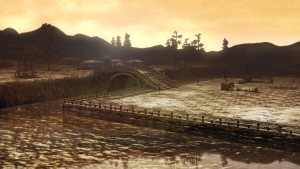 新场地新下邳:地上的积雪被夕阳染成红色的场地。在东侧有着城塞,在那周围则被水路环绕着