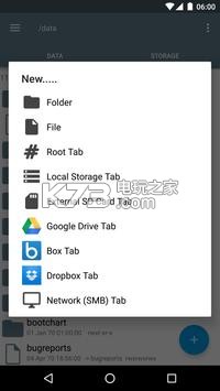 其特点包括多个选项卡,谷歌驱动器,箱,升降梭箱和网络(SMB)的支持下,SQLite数据库查看器,文本编辑器,创建和解压ZIP或TAR / gzip的文件,解压RAR压缩文件,多选,执行脚本,搜索,重新挂载,权限,书签,发送文件(通过电子邮件,蓝牙等),图像的缩略图,APK二进制XML查看器,更改文件所有者/组,创建符号链接,“打开方式”的设施,MD5,创建快捷方式。