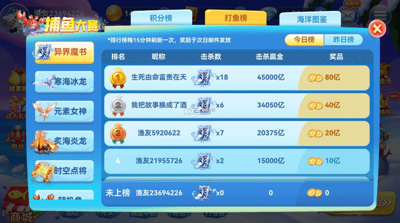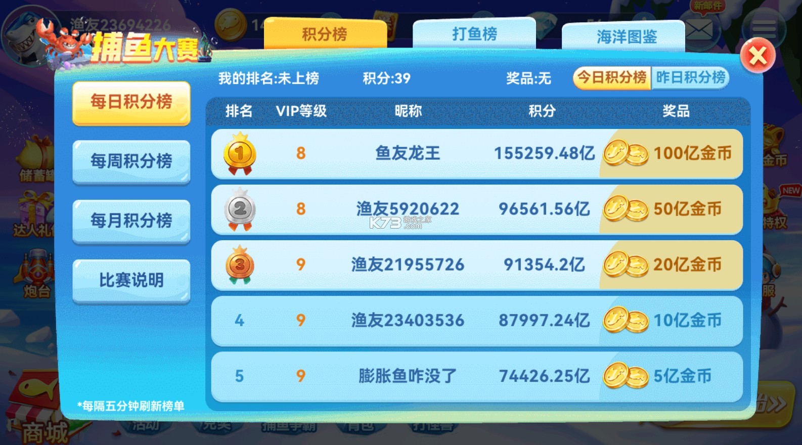 1.所有比赛直接进入渔场就能参赛,无须报名,排行榜会按照捕鱼积分进行排名