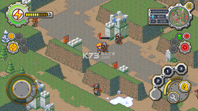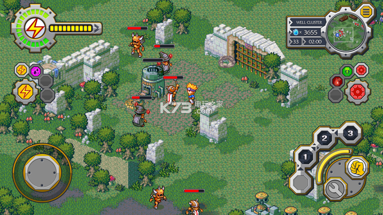 - 每天建立你的防御工事来防御发条军的定时攻击。使用数十尊炮塔、陷阱与助手来阻止敌人前进。