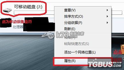 2、鼠标右键点击移动设备盘符,然后点击“属性”。如下图:
