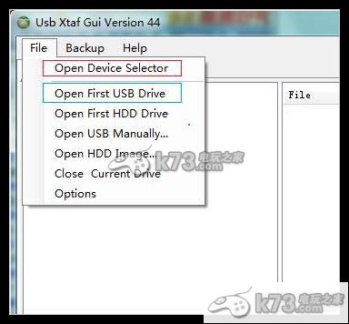 插入已经分配好XBOX360空间的U盘,然后打开USB XTAF GUI软件,点击左上角的“File”然后红框处的“Open Device Selector”,选择用于XBOX360的U盘盘符打开。当然你只插了一个U盘的话,也可以点击蓝框直接打开那个U盘。