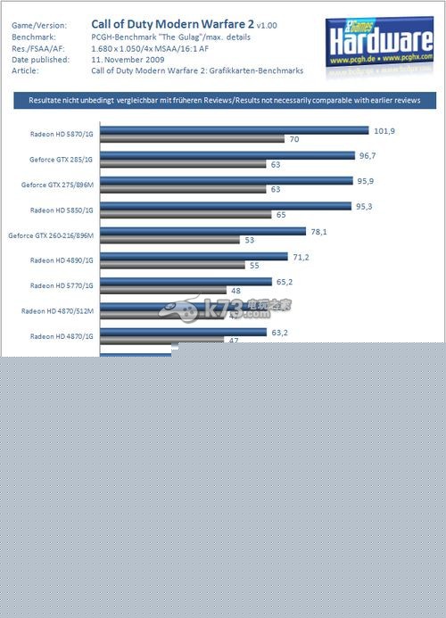 德国游戏硬件评测网站对《使命召唤6:现代战争2》进行了硬件性能测试,测试场景选取的是第二章的“The Gulag”任务的开始部分。中士Gary “Roach” Sanderson 和上尉McTavish坐在一个Little Bird直升机上停留在俄国的古拉格集中营以及附近徘徊的场所。烟雾、高温及景深后期处理的大爆炸效果,伴随大量阴影效果以及两架Little Bird直升机和大量士兵,这些主要考验了显卡的性能。越是帧数低的场景越是战斗激烈的地方,这里更需要高的帧数来维持生存。