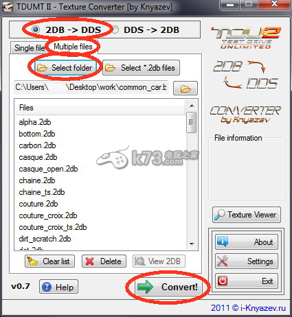打开Texture_Converter.exe 选择2DB转DDS格式 选择Multiple files 选择work\common_car.bnk\5prepared\pc\euro\vehicules\common\common_maps\all文件夹 点击Convert转换此文件夹内的所有2DB格式为DDS格式
