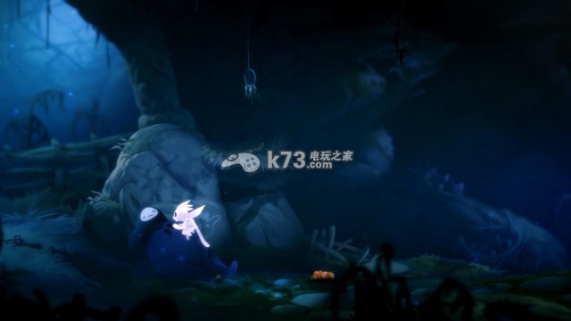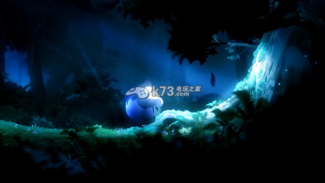 step1.(此时玩家控制纳鲁)纳鲁往右侧走去,跳过一块小石后,在右侧第二块小石上看见叶子落到地面化作一只会发出光亮的精灵,他便是奥日。