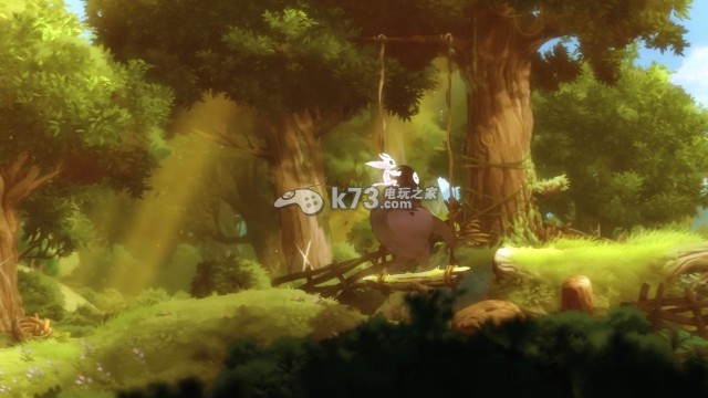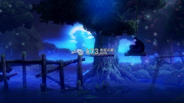 (此时玩家控制纳鲁)奥日跳上了纳鲁的肩膀上,纳鲁跳上右侧的秋千继续往右侧走去,发现对岸还有一片果树林,果树上依然果实累累。